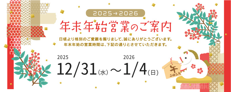 2025-12-17 年末年始休業のお知らせ(2025年-2026年) いつも当社サービスをご利用いただき、誠にありがとうございます。 当社では下記の期間を年末年始休業といたしますので、予めご了承くださいますようお願い申し上げます。■ 2025年12月31日(水)~2026年 1月4日(日) 新年は1月5日(月曜日)より業務を行います。 ご不便をおかけしますが、何卒ご理解いただきますようお願いいたします。 « 前の記事へ